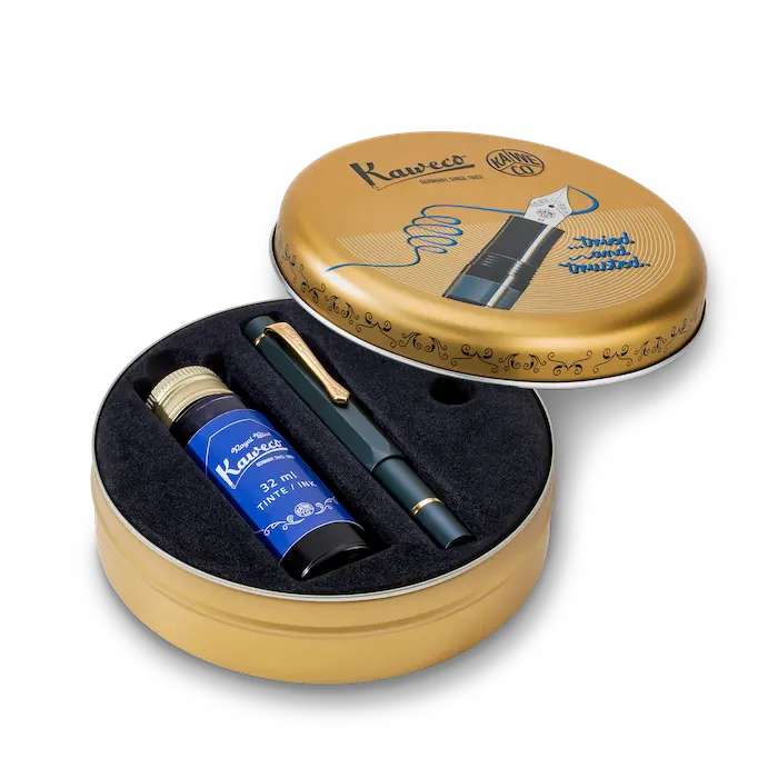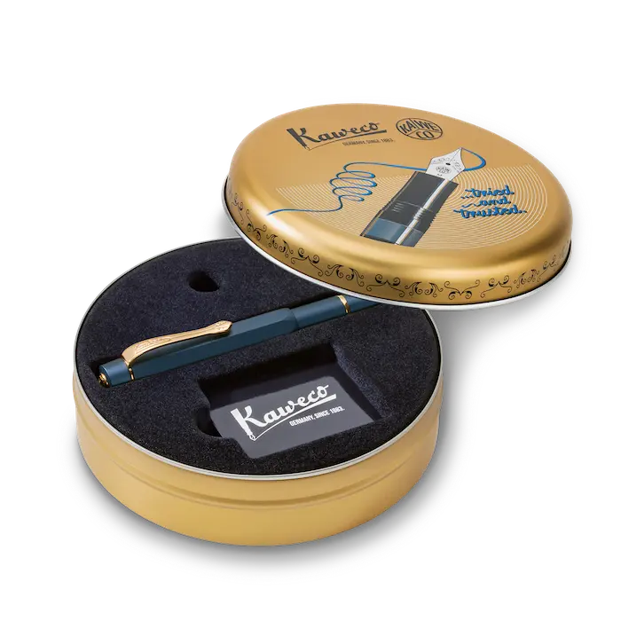 Die vergoldete Stahlfeder ist in den Größen EF, F, M, B und BB verfügbar. Die modulare 190er Federeinheit kann jederzeit ausgetauscht werden. Der Füllhalter wird in der klassischen Kaweco Runddose geliefert – perfekt als Geschenk für Sammler und Liebhaber hochwertiger Schreibkultur.