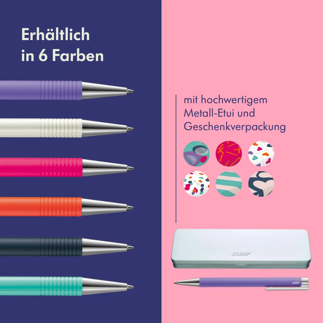 Gestalten Sie Ihr eigenes LAMY Geschenk-Set: Kombinieren Sie verschiedene Farben oder ergänzen Sie den Stift mit einem passenden Notizbuch oder Etui – für ein individuelles Präsent mit persönlichem Charakter.